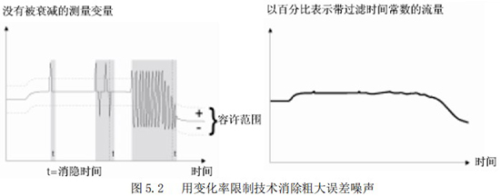 “變化率限制值”與“不敏感時(shí)間值”是用來(lái)消除某些增加阻尼不能除去的噪聲。它能夠從真實(shí)的流量信號(hào)中判別出階躍信號(hào)引起的噪聲和漿液尖狀噪聲。這種判別是以變化率的限制和持續(xù)時(shí)間為依據(jù)的。圖 5.2 所示為使用變化率限制技術(shù)去除粗大誤差的原理說(shuō)明。該功能為在前面采樣中獲得的流量數(shù)據(jù)經(jīng)一階濾波后的,設(shè)定某一上限和下限(變化率)。如果當(dāng)前采樣的流量數(shù)據(jù)超過(guò)或低于這個(gè)*限值,而且在超過(guò)或低于這個(gè)*限值的變化時(shí)間之內(nèi),則認(rèn)為這種變化是由于噪聲所引起的,CPU 予以切除;而當(dāng)超過(guò)或低于這個(gè)*限值的變化在設(shè)置的不敏感時(shí)間以外,則認(rèn)為這種變化是由于真正的流量變化所引起,CPU 就認(rèn)可是測(cè)量流量的變化。