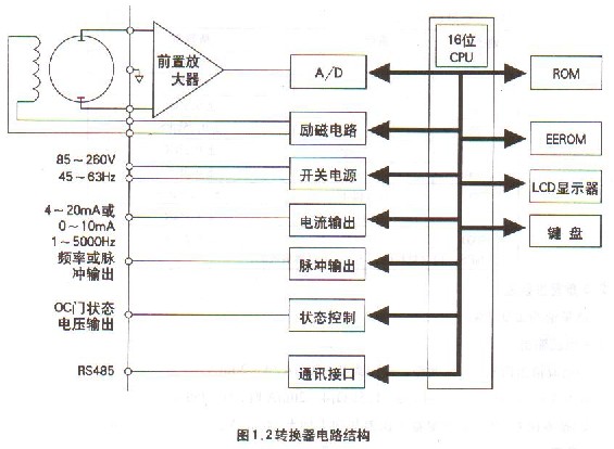 自來水電磁流量轉(zhuǎn)換器一方面向電磁流量傳感器勵(lì)磁線圈提供穩(wěn)定的勵(lì)磁電流,以達(dá)到B是個(gè)常量;同時(shí)把轉(zhuǎn)換器感應(yīng)的電動(dòng)勢放大、轉(zhuǎn)換成標(biāo)準(zhǔn)的電流信號(hào)或頻率信號(hào),便于流量的顯示、控制與調(diào)節(jié)。圖1.2所示為轉(zhuǎn)換器電路結(jié)構(gòu)。