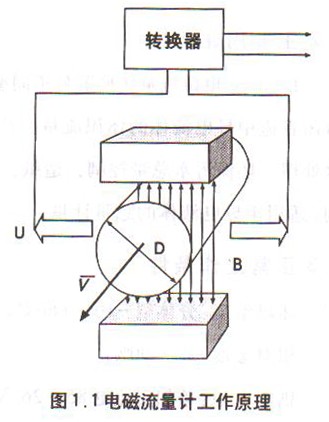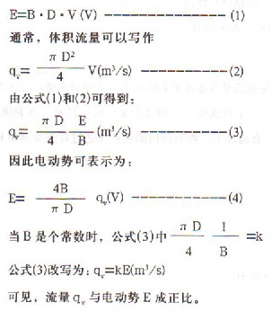 在圖1.1中,當(dāng)導(dǎo)電流體以平均V(m/s)通過裝有一對測量電*的一根內(nèi)徑為D(m)的絕緣管子流動(dòng)時(shí),并且該管子處于一個(gè)均勻的磁感應(yīng)強(qiáng)度為B(T)的磁場中。那么,在一對電*上就會(huì)感應(yīng)出垂直于磁場方向和流動(dòng)方向的電動(dòng)勢(E)。由電磁感應(yīng)定律可寫做(1)式: