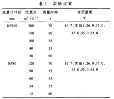 為實(shí)驗(yàn)介質(zhì),選取DN80mm和DN100mm的0.5級(jí)電磁流量計(jì),每個(gè)測試點(diǎn)測量3次,共180次測試,研究電磁流量計(jì)特征系數(shù)隨溫度變化的特性。具體實(shí)驗(yàn)方案見表1。