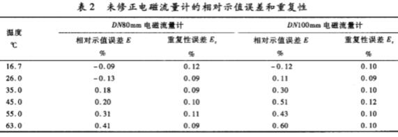 根據(jù)JJG1033—2007,DN80mm和DN100mm電磁流量計(jì)在不同溫度下的相對(duì)示值誤差和重復(fù)性見表2??梢钥闯?,當(dāng)流體溫度在16.7—30.0℃時(shí),電磁流量計(jì)的相對(duì)示值誤差在40.13%以內(nèi),筆者認(rèn)為在此溫度范圍內(nèi),介質(zhì)溫度變化對(duì)電磁流量計(jì)的影響可以忽略。當(dāng)流體溫度在30~63℃時(shí),電磁流量計(jì)的相對(duì)示值誤差正差偏,*大誤差為0.60%,對(duì)于DN100mm的電磁流量計(jì),其相對(duì)示值誤差已經(jīng)超出了0.5級(jí)電磁流量計(jì)的精度范圍。因此,當(dāng)電磁流量計(jì)用于高溫環(huán)境的高精度測量時(shí),介質(zhì)溫度的影響-定不能忽略。