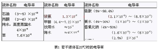 工業(yè)用水及其水溶液的電導率大于10-4S/cm,酸、堿、鹽液的電導率在10-4~10-1S/cm之間,使用不存在問題,低度蒸餾水為10-5S/cm也不存在問題。石油制品和有機溶劑電導率過低就不能使用。表1列出若干液體的電導率。從資料上查到有些純液或水溶液電導率較低,認為不能使用,然而實際工作中會遇到因含有雜質(zhì)而能使用的情況,這類雜質(zhì)增加了電導率。對于水溶液,資料中的電導率是用純水配比在實驗室測得的,實際使用的水溶液可能用工業(yè)用水配比,電導率將比查得的要高,也有利于流量測量。
