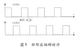 該電路主要由勵(lì)磁時(shí)序發(fā)生單元、三態(tài)緩沖器及隔離光耦組成。勵(lì)磁時(shí)序由水箱排水流量計(jì)系統(tǒng)的控制核心產(chǎn)生。采用DSP的EPWM外設(shè)模塊,通過設(shè)定其內(nèi)部定時(shí)器的工作模式發(fā)出所要求的勵(lì)磁頻率的勵(lì)磁時(shí)序PWM信號(hào)CT_1和CT_2。由于勵(lì)磁控制系統(tǒng)中的勵(lì)磁工作電源的電壓要比DSP的工作電源電壓高得多,為防止勵(lì)磁電路故障對(duì)系統(tǒng)控制核心產(chǎn)生致命影響,采用光耦將控制部分與勵(lì)磁部分進(jìn)行隔離。另外,由于DSP引腳的驅(qū)動(dòng)能力有限,所以在DSP與隔離光耦之間加入三態(tài)緩沖器以驅(qū)動(dòng)隔離光耦的輸入級(jí)。并且,DSP能夠通過GPIO口控制三態(tài)緩沖器上的使能引腳來使能和禁止勵(lì)磁,以在檢測(cè)到電路故障時(shí)迅速關(guān)斷H橋所有橋臂。該勵(lì)磁時(shí)序產(chǎn)生電路通過軟件編程可產(chǎn)生如圖5所示的單頻矩形波。在實(shí)際應(yīng)用中,由于組成H橋的達(dá)林頓三*管與MOS管導(dǎo)通與關(guān)斷的時(shí)間不一致,易在勵(lì)磁方向切換瞬間,產(chǎn)生上下橋臂同時(shí)導(dǎo)通的現(xiàn)象,反映在勵(lì)磁電流波形上為一幅值很高的窄脈沖。該脈沖電流不僅容易引起遲滯比較電路的誤輸出,從而導(dǎo)致高低壓切換電路與電流旁路電路的誤動(dòng)作,而且對(duì)恒流控制電路產(chǎn)生沖擊,減小三端穩(wěn)壓芯片的使用壽命,同時(shí)還會(huì)產(chǎn)生EMC電磁干擾,給測(cè)量精度帶來影響。所以實(shí)際應(yīng)用時(shí),如圖5所示對(duì)方波勵(lì)磁時(shí)序添加死區(qū),可以明顯減小上述現(xiàn)象。