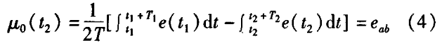 分體型電磁流量計一般都采用工頻交流電源供電,其電源電壓的幅值和頻率的變化都會給分體型電磁流量計帶來電源性干擾噪聲。對電源電壓的幅值變化,因采用多級集成穩(wěn)壓,一般而言電源電壓的幅值變化對電磁流量的測量精度影響不大。當電源電壓的頻率波動時,雖然其波動范圍有限,但對分體型電磁流量計測量精度影響較大。為了解決工頻干擾問題,實現(xiàn)對流體流速感應電勢e柚信號的準確測量,需利用以下基本關(guān)系:①勵磁周期為工頻周期的整數(shù)倍,即勵磁頻率為50/nHz(n為偶數(shù));②正負勵磁下的同相位采樣。圖2是對應低頻矩形波勵磁形式下的典型電勢信號形式,按上述關(guān)系在一個勵磁周期下,若假設t。和t:點為工頻干擾的等效干擾點,且采樣寬度T=T1=T2,則e –ab的基本算式為:,