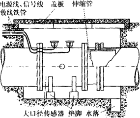 由于大口徑管道在多數(shù)場(chǎng)合下是埋在地下的,因此大口徑傳感器在安裝前應(yīng)做好水泥地坑。圖6-19所示是在給排水系統(tǒng)中常見的安裝形式。水泥地坑應(yīng)有足夠的活動(dòng)空間,側(cè)壁埋有敷設(shè)電纜的鋼管,上有蓋板防止雨淋,下有泄水管以免坑內(nèi)積水而使傳感器侵水。為了拆裝方便,傳感器應(yīng)放在墊腳上,且在下游側(cè)裝有活絡(luò)的伸縮管。圖6-20是智能型防腐電磁流量計(jì)在地下水泥管污水排放系統(tǒng)中的安裝實(shí)例。