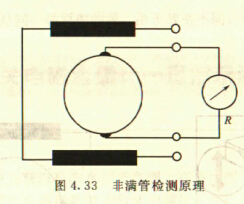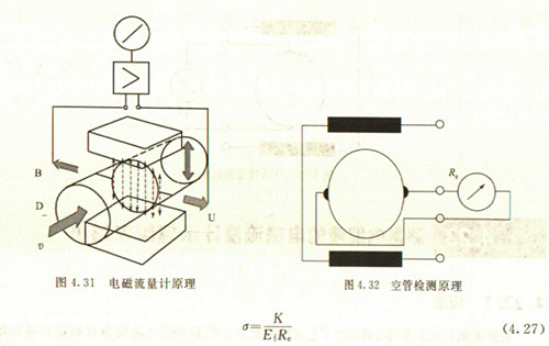 非滿管檢測也是基于電導率檢側的方法。在圖4.33所示的電磁流量傳感器中,增加了一個(或一對)非滿管檢測電*。當導管內液體滿管時,頂部電*與其他電*之間的電阻值很小;而當存在非滿管情況時,頂部電*與導電液體之間有氣體阻隔,所以電*電阻顯著增大,從而做出非滿管判斷。