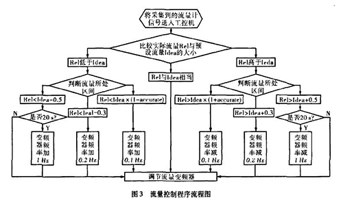 實(shí)際生產(chǎn)中流量一直在某個(gè)區(qū)域內(nèi)波動(dòng),且其動(dòng)態(tài)特性不易掌握。從上面的理論中我們能夠讓誤差△£盡可能的小,這樣距我們所需要的理論值%就越接近。而減小誤差需要我們把n取的盡可能大,也就是在生產(chǎn)時(shí)間內(nèi)劃分更多的周期去調(diào)節(jié)流量。當(dāng)工控機(jī)根據(jù)防爆型電磁流量計(jì)價(jià)格傳送回來(lái)的信號(hào)發(fā)出調(diào)節(jié)變頻器工作頻率的指令后,電機(jī)調(diào)整功率到防爆型電磁流量計(jì)價(jià)格的實(shí)際測(cè)量為一個(gè)工作周期,我們知道從指令發(fā)送到實(shí)際測(cè)量值返回有一個(gè)較大的滯后,如果調(diào)節(jié)的周期時(shí)間小于流量計(jì)本身的一個(gè)工作周期,那么顯然不可能達(dá)到減小誤差的目的。利用模糊控制思想H。,在控制程序中我們把流量的波動(dòng)區(qū)域劃分為±缸×Yo,Yo-t-O.3,Yo±0.5四個(gè)區(qū)域,其中缸為可調(diào)節(jié)的誤差范圍,生產(chǎn)中我們?nèi)?.015,流量區(qū)域劃分的單位均為t/h。針對(duì)不同的區(qū)域采取不同的調(diào)整方案。具體流程如圖3所示。圖中變量Rel表示實(shí)際測(cè)量的流量,變量Idea表示理論流量。