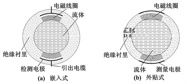 電容式150度高溫電磁流量計(jì)從根本上解決了電*表面附著、腐蝕、摩擦等問題,其電*與被測(cè)流體間有絕緣襯里隔離,或者直接采用絕緣測(cè)量管。電*置于測(cè)量管外面或鑲嵌于測(cè)量管內(nèi)部。嵌人式150度高溫電磁流量計(jì)和外貼式150度高溫電磁流量計(jì)的結(jié)構(gòu)如圖2所示。