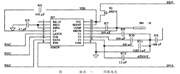 HT2012需要外部提供460.8kHz的時鐘信號,且要求時鐘頻率的誤差是0.1%,若直接入一個460.8kHz的晶振不僅會引起系統(tǒng)功耗的增加,而且該晶振屬于非標準晶振,需專門定制。為了解決這一問題,在系統(tǒng)中采用一片1.8432MHz的晶振以產(chǎn)生時鐘信號,再經(jīng)分頻器CD4013進行4分頗,可輸出1.8432MHz/4=460.8kHz的分頻信號供HT2012使用。AD421其內(nèi)部的電壓調(diào)節(jié)器與外部的場效應(yīng)管DN25D對輸入到AD421的電壓進行調(diào)整,可提供+3.3V電壓作為其他設(shè)備的電源。HART發(fā)出的FSK信號,經(jīng)過一個電容耦合送到AD421中,轉(zhuǎn)換成相應(yīng)的0.5mA正弦電流信號,實現(xiàn)電壓信號到電流信號的轉(zhuǎn)換,同時,疊加在4~20mA的電流上送給接收設(shè)備,實現(xiàn)了HART協(xié)議的信息的交換。本電路耦合電容取為0.0033μF,如圖5所示。
