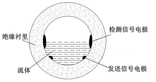 ①多電*式非滿管氯化鐵流量計(jì)。其底部是一對(duì)信號(hào)注人電*,中間有多對(duì)測(cè)量電*,頂端有一個(gè)滿管電*。在滿管情況下,該流量計(jì)與普通的氯化鐵流量計(jì)的功能相同,滿管情況下流體的橫截面積是固定的,此時(shí)計(jì)算流量值只需要測(cè)量流體的流速即可。當(dāng)流體非滿管時(shí),滿管電*檢測(cè)到管道非滿狀態(tài),利用算法修正測(cè)量值,此時(shí)流量計(jì)的測(cè)量方式改成測(cè)量流體流速和液面高度。信號(hào)注人電*與在不同位置的三對(duì)測(cè)量電*共同工作,用于測(cè)量液位面的高度和流體的速度。多電*式非滿管氯化鐵流量計(jì)結(jié)構(gòu)簡(jiǎn)圖如圖3所示。