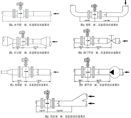 傳感器安裝管道上游側(cè)直管段長度應(yīng)大于或等于10D,下游側(cè)應(yīng)不小于5D(D為被測管道通徑)。