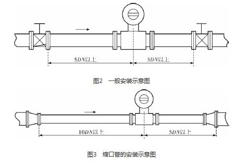 砂漿流量表的安裝質(zhì)量對(duì)其測(cè)量結(jié)果的影響較大,因此在安裝時(shí)需要注意幾個(gè)問(wèn)題。*先,砂漿流量表直管段的選擇在配管時(shí)一定要按照要求進(jìn)行選擇,一般選擇流量計(jì)通徑與工藝管道通徑相同,即可滿足工程需要,而且安裝方便、壓力損失小,流量計(jì)直管段上游側(cè)的長(zhǎng)度不少于5倍工藝管道直徑,下游側(cè)的長(zhǎng)度不少于3倍工藝管道直徑(圖2)。但在流速太慢而又要求精度較高或需要變徑的應(yīng)用場(chǎng)合,可選擇通徑小于工藝管道通徑的流量計(jì),以提高測(cè)量精度,此時(shí)流量計(jì)上、下游必須加裝異徑管,且進(jìn)口異徑管上游側(cè)應(yīng)有長(zhǎng)于10倍工藝管道直徑的直管段,下游側(cè)應(yīng)有長(zhǎng)于5倍工藝管道直徑的直管段(圖3)。