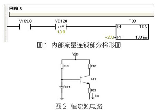 (2)PLC及模塊。PLC及模塊是自動(dòng)化控制系統(tǒng)主要設(shè)備,且PLC及模塊屬于高集成高精密電子設(shè)備,保持室內(nèi)整潔舒適,可以提高自動(dòng)化系統(tǒng)運(yùn)行穩(wěn)定性。PLC及模塊硬件運(yùn)行可靠,內(nèi)部控制程序是其控制核心軟件,如PLC硬件出現(xiàn)故障或損壞一般直接更換,但原內(nèi)部控制軟件無(wú)法上傳,整個(gè)控制系統(tǒng)成失控狀態(tài)。所以其內(nèi)部控制程序在調(diào)試驗(yàn)收合格后應(yīng)及時(shí)備份并做好標(biāo)記,為以后修復(fù)PLC故障提供保障。PLC系統(tǒng)的維護(hù)技術(shù)人員需掌握一定基礎(chǔ)PLC控制邏輯原理,對(duì)準(zhǔn)確判斷PLC故障點(diǎn)有很大的幫助。例如選礦廠水泵房S7-200系列PLC自動(dòng)抽水系統(tǒng)出現(xiàn)如下故障 :觸摸屏能控制變頻器啟動(dòng)水泵抽水,但在短時(shí)間內(nèi)會(huì)自動(dòng)停泵,導(dǎo)致無(wú)法正常抽水。通過(guò)故障現(xiàn)象可初步判斷PLC及模塊硬件設(shè)備正常,主要由于某個(gè)變量有問(wèn)題導(dǎo)致連鎖停機(jī)。打開(kāi)備份PLC控制梯形圖程序進(jìn)行相關(guān)分析,原來(lái)是排污流量計(jì)瞬時(shí)流量數(shù)值做了連鎖,其在一定時(shí)間內(nèi)瞬時(shí)流量不大于10m 3 /h時(shí),自動(dòng)停泵,電磁流量模擬量輸出電流值僅為4ma且無(wú)變化,確定排污流量計(jì)有故障??膳R時(shí)應(yīng)急維修,模擬量模塊輸入模擬電流值10ma~20ma之間一固定數(shù)值即可恢復(fù)正常運(yùn)行。制作簡(jiǎn)單恒流源電路代替排污流量計(jì)輸出的模擬電流量,實(shí)現(xiàn)解決水泵無(wú)法正常運(yùn)行的故障。