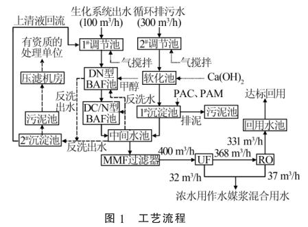 2種廢水在中間水池混勻后,通過(guò)泵提升進(jìn)入保安過(guò)濾器,進(jìn)一步去除細(xì)小的懸浮物后經(jīng)過(guò)增壓泵進(jìn)入超濾膜(UF)處理系統(tǒng)和反滲透(RO)系統(tǒng),然后通過(guò)水廠流量計(jì)進(jìn)行計(jì)量。反滲透出水直接進(jìn)入回用水池達(dá)標(biāo)回用,超濾濃水以及反滲透濃水用作水煤漿混合用水。污泥池中的污泥通過(guò)泵打入帶式機(jī)壓濾處理,濾液自流進(jìn)入1#調(diào)節(jié)池。工藝流程見(jiàn)圖1。
