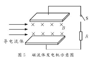 【例1】圖5為磁流體發(fā)電機(jī)示意圖。設(shè)兩金屬板間的距離為d,兩*板間勻強(qiáng)磁場(chǎng)的磁感應(yīng)強(qiáng)度為B。等離子體垂直進(jìn)入磁場(chǎng)的速度為v,單個(gè)離子所帶的電荷量為q。離子通道(即兩*板內(nèi)所圍成的空間)的等效電阻為r,負(fù)載電阻為R。則下列判斷正確的是( ?。?br/>A。該發(fā)電機(jī)的電動(dòng)勢(shì)E=Bdv