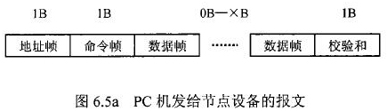 在硫酸流量表等節(jié)點設備和C機通信的過程中,由地址幀、命令幀、數(shù)據(jù)幀、校驗和可組成各種功能不同的報文。由于采用主從工作方式來實現(xiàn)通信,硫酸流量表等節(jié)點設備僅能接收并執(zhí)行PC機發(fā)送來的控制命令,而不能發(fā)送命令給PC機。因此,由PC機發(fā)往流量計等節(jié)點設備的報文一般包括一個地址幀,一個命令幀,若干個數(shù)據(jù)幀和一個校驗和,其報文格式圖.6a5所示;而由流量計等節(jié)點設備發(fā)往PC機的報文一般包括一個地址幀,若干個數(shù)據(jù)幀和一個校驗和,其報文格式如圖6.5b所示。