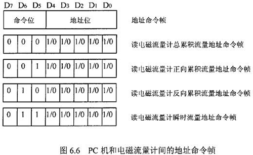 由于RS一485電氣標準規(guī)定每段只能聯(lián)結犯個節(jié)點設備,因此可用地址幀中五個二進制位表示這32個地址,其余3位用來表示命令,從而構成地址命令幀。對于控制命令需求不超過八個的通信系統(tǒng),采用地址命令幀可壓縮報文長度提高通信效率。在污水網(wǎng)絡監(jiān)控系統(tǒng)中,硫酸流量表和PC機通信的主要目的是將流量計中的有用數(shù)據(jù)讀到PC機中。這些數(shù)據(jù)包括:總累積流量、正向累積流量、反向累積流量、瞬時流量。通信時,PC機只需向硫酸流量表發(fā)送讀總累積流量、讀正向累積流量、讀反向累積流量、讀瞬時流量命令即可,因此二者間通信所用的地址幀和命令幀可合二為一,用一個地址命令幀代替。PC機和硫酸流量表間的地址命令幀定義如圖.66所示。根據(jù)污水網(wǎng)絡監(jiān)控系統(tǒng)中PC機與硫酸流量表間通信的特殊性,二者通信所使用的報文可簡化為圖.67的格式。
