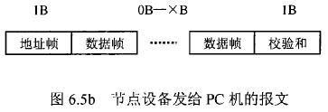 在紙漿流量計等節(jié)點設(shè)備和C機(jī)通信的過程中,由地址幀、命令幀、數(shù)據(jù)幀、校驗和可組成各種功能不同的報文。由于采用主從工作方式來實現(xiàn)通信,紙漿流量計等節(jié)點設(shè)備僅能接收并執(zhí)行PC機(jī)發(fā)送來的控制命令,而不能發(fā)送命令給PC機(jī)。因此,由PC機(jī)發(fā)往流量計等節(jié)點設(shè)備的報文一般包括一個地址幀,一個命令幀,若干個數(shù)據(jù)幀和一個校驗和,其報文格式圖.6a5所示;而由流量計等節(jié)點設(shè)備發(fā)往PC機(jī)的報文一般包括一個地址幀,若干個數(shù)據(jù)幀和一個校驗和,其報文格式如圖6.5b所示。