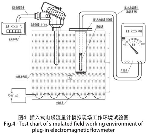 其原因是:勵(lì)磁線圈的阻值及匝數(shù)是按照常溫狀態(tài)下進(jìn)行設(shè)計(jì)的,而含有勵(lì)磁線圈的酸水流量計(jì)經(jīng)常是高于常溫狀態(tài)下進(jìn)行安裝、使用(如:高爐回水、供熱管道等),勵(lì)磁線圈的阻值隨使用環(huán)境溫度的變化而變化,致使酸水流量計(jì)測量時(shí)的準(zhǔn)確度大為降低,性能的不確定性大為增加,為了保證儀表的高準(zhǔn)確度和穩(wěn)定性,在不同的季節(jié)(主要是環(huán)境溫度和介質(zhì)溫度),經(jīng)過大量模擬現(xiàn)場實(shí)際情況的試驗(yàn),并結(jié)合轉(zhuǎn)換器的技術(shù)參數(shù)要求,得出一個(gè)完善的勵(lì)磁線圈各種技術(shù)參數(shù)。模擬現(xiàn)場試驗(yàn)裝置如圖 4 所示。