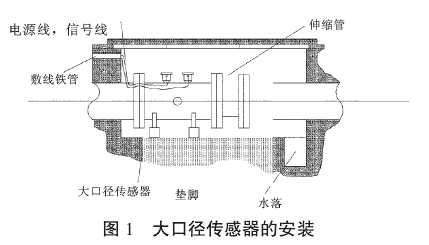由于自來水行業(yè)的特點(diǎn),管網(wǎng)中運(yùn)行的大口徑傳感器基本安裝在井內(nèi),井內(nèi)容易積水或滲漏水,使傳感器接線盒內(nèi)受潮,導(dǎo)致計(jì)量不準(zhǔn)確,即使防護(hù)等級為IP68的傳感器,也常出現(xiàn)該問題。要拆除原有接線盒內(nèi)膠封,重新制作膠封,是實(shí)踐中常用的方法之一。所以,在安裝大口徑傳感器之前必須要做好相對應(yīng)的傳感器井。給排水系統(tǒng)中常見的安裝形式如圖1所示。傳感器井應(yīng)有足夠的活動空間,側(cè)壁埋有敷設(shè)電纜的鋼管,上有蓋板防止雨淋,下有泄水以免坑內(nèi)積水而使傳感器浸水。傳感器應(yīng)放在專用支撐架,在出水側(cè)裝有活絡(luò)的伸縮管。