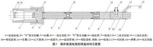 注入剖面測(cè)試中,溢流量對(duì)測(cè)量結(jié)果影響至關(guān)重要。如圖 1 所示,測(cè)井普通防噴盒采用 3 級(jí)密封: * 1 級(jí)密封為阻流管( 6) ,測(cè) 20 井次左右阻流管內(nèi)徑變大,溢流量增加; * 2 級(jí)為橡膠盤根和鋼墊( 15) ; * 3 級(jí)為橡膠盤根( 10) ,調(diào)整壓帽( 11) 松緊程度,橡膠盤根抱緊電纜; * 2 級(jí)和* 3 級(jí)密封更換一次橡膠盤根測(cè)試 3 ~ 5 井次溢流量增加。普通防噴盒無(wú)法實(shí)現(xiàn)溢流量,沒有捕捉器、防噴器和放噴組裝件。普通電纜防噴裝置工作壓力20 MPa,耐壓 40 MPa。