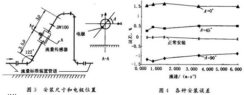 3)電磁流量傳感器在彎管下游即使有足夠長(5D)的直管段,亦應(yīng)按“45°安裝”,作為減小彎管撓流影響,降低附加誤差的措施。