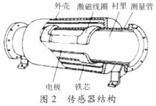 電磁流量計(jì)由流量傳感器和轉(zhuǎn)換器兩部分組成。傳感器典型結(jié)構(gòu)示意如圖2,測量管上下裝有激磁線圈,通激磁電流后產(chǎn)生磁場穿過測量管,一對電*裝在測量管內(nèi)壁與液體相接觸,引出感應(yīng)電勢,送到轉(zhuǎn)換器。激磁電流則由轉(zhuǎn)換器提供。