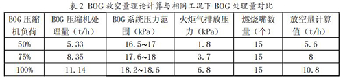 為維持 BOG 系統(tǒng)壓力穩(wěn)定,在正常工況下通過 BOG壓縮機(jī)回收 BOG 方式進(jìn)行,在檢修期間采用火炬放空方式進(jìn)行。從表 2 中可以看出,在系統(tǒng)壓力維持一定值時,理論計(jì)算值與 BOG 壓縮機(jī)處理量基本相同,火炬氣放空量 計(jì)算方法可行。