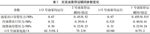 通過(guò)內(nèi)部旁通將冷油與熱油混合,經(jīng)過(guò)銅粉- 煤油 - 蠟感溫元件控制冷熱油混合比例,將油溫調(diào)節(jié)到 49 ℃。一臺(tái)氨水流量計(jì)穩(wěn)定運(yùn)行,油泵出口母管壓力 0. 5 MPa,潤(rùn)滑油母管壓力 0. 24 MPa,均屬于正常情況,而兩臺(tái)交流油泵并列運(yùn)行時(shí),停運(yùn)其中一臺(tái)交流油泵瞬間會(huì)觸發(fā)電磁流量計(jì)出口母管壓力開關(guān)動(dòng)作,說(shuō)明停運(yùn)瞬間油壓發(fā)生波動(dòng),且油泵出口母管油壓波動(dòng)至小于 0. 45 MPa。正常運(yùn)行時(shí)電磁流量計(jì)出口油溫 71.5 ℃,冷油器出口溫度45 ℃,混合后潤(rùn)滑油母管溫度52.5 ℃,由能量守恒定律可知,經(jīng)過(guò)冷油器的油量/不經(jīng)冷油器的油量= ( 71.5-52.5) ÷ ( 52.5- 45) = 2. 53,說(shuō)明有 70% 左右的油量經(jīng)過(guò)冷油器。當(dāng) 2 臺(tái)氨水流量計(jì)運(yùn)行時(shí)油量大于單泵運(yùn)行,其中一臺(tái)電磁流量計(jì)瞬間停運(yùn)時(shí)油量減少,尤其是經(jīng)過(guò)冷油器的油量大量減少,油量在溫控閥二次分配過(guò)程中出現(xiàn)調(diào)節(jié)異常,導(dǎo)致油壓過(guò)大波動(dòng)。為檢驗(yàn)溫控閥工作情況,保持 1 號(hào)、2 號(hào)交流油泵運(yùn)行,選取機(jī)組正常帶負(fù)荷運(yùn)行時(shí)油溫 52 ℃,分別停運(yùn) 1、2 號(hào)交流油泵,觀察 1、2 號(hào)交流油泵停運(yùn)瞬間油泵出口母管壓力波動(dòng)情況,試驗(yàn)各參數(shù)變化見(jiàn)表 2。