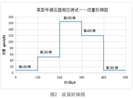該測(cè)試主要利用實(shí)驗(yàn)室測(cè)試條件,模擬客戶現(xiàn)場(chǎng)使用情況。其主要測(cè)試內(nèi)容包括:測(cè)試電磁流量計(jì)在+23℃,-30℃和-40℃三種溫度下,電磁流量計(jì)出口壓力分別在2.1kPa和30kPa時(shí),流量分別從*1階梯到*5階梯時(shí)的響應(yīng)速度,客戶所提供的流量階梯如圖2所示。橫軸表示下游球閥開啟動(dòng)作時(shí)間,縱軸表示循環(huán)水流量計(jì)下游需要的流量q。