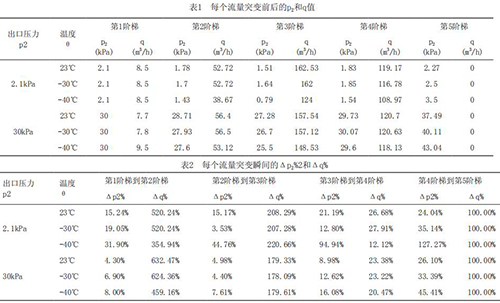 通過實(shí)驗(yàn)室的模擬測(cè)試,對(duì)于2.1kPa和30kPa出口設(shè)定壓力,分別得到的6條曲線,3條不同溫度下的壓力曲線和3條不同溫度下的流量曲線,如圖4和圖5所示。在*120s、240s和360s時(shí),由于流量突然增加,造成出口壓力瞬時(shí)降低。在*480s時(shí),由于流量突然減小,造成出口壓力瞬時(shí)升高。圖中的橫軸表示球閥的動(dòng)作響應(yīng)時(shí)間,*一縱軸對(duì)應(yīng)電磁流量計(jì)出口壓力p2,*二縱軸表示電磁流量計(jì)對(duì)應(yīng)該出口壓力下流量q。