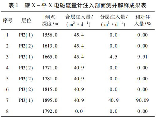 2017 年 9 月在大慶油田采油八廠肇 X - 平 X 水平井注水井中*次進(jìn)行了水平井注入剖面測(cè)井現(xiàn)場(chǎng)試驗(yàn)。該井斜深2 055. 42 m,水平段長(zhǎng)度為568. 46 m,試驗(yàn)?zāi)康氖峭ㄟ^(guò)注入剖面測(cè)井了解該井各層段的注水情況,同時(shí)對(duì)水平井測(cè)井工藝、儀器的適用性、井下?tīng)恳骷熬谳o助裝置等設(shè)備的工作有效性和可靠性進(jìn)行評(píng)價(jià)。現(xiàn)場(chǎng)試驗(yàn)中,在密閉條件下錄取到了該井的注入剖面測(cè)井資料,進(jìn)行了重復(fù)測(cè)量,重復(fù)測(cè)量結(jié)果在誤差允許范圍內(nèi),測(cè)井成果見(jiàn)表 1。該井施工壓力 6. 0 MPa,注入量45. 4 m3 /d,有 7 個(gè)射孔層,分 8 個(gè)測(cè)點(diǎn)測(cè)量,2 個(gè)層有吸入顯示,其中,P13( 1) ( 1 734 ~ 1 767 m) 層絕對(duì)吸入量4. 5 m3 /d,相對(duì)吸入量為9. 91 %,P13( 1) ( 1 899 ~1 943 m)層絕對(duì)吸入量 40. 9 m3 /d,相對(duì)吸入量為 90. 09% ,測(cè)井成果見(jiàn)表 1。通過(guò)與甲方的交流,再結(jié)合該井的動(dòng)靜態(tài)資料及周圍井的工作狀況,采油廠的地質(zhì)人員認(rèn)為本次測(cè)井結(jié)果能比較準(zhǔn)確地反映該井的注入情況。
