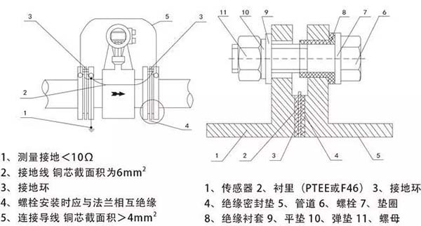 為了使儀表可靠的工作,傳感器產(chǎn)生的流量信號(hào)非常微弱,通常為微伏或毫伏級(jí)。防止外界電干擾的影響是用好流量計(jì)的一個(gè)重要因素,接地是解決電干擾影響的一個(gè)很有效的措施。因此,傳感器應(yīng)有良好的單獨(dú)接地線,接地電阻<10Ω。在連接傳感器的管道內(nèi)若涂有絕緣層或是非金屬管道時(shí),傳感器兩側(cè)還應(yīng)加裝接地環(huán)或內(nèi)置接地電*。