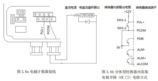 3.4.5 頻率(脈沖)、上下限報警、流向標示等輸出均為集電*開路的電平輸出信號。