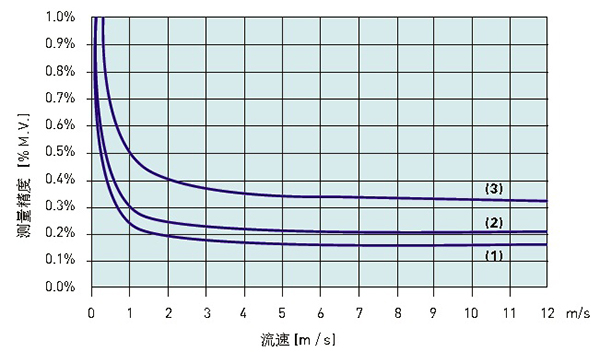 原水流量計(jì)實(shí)質(zhì)是測量介質(zhì)的流速,它是速度式流量計(jì)。一般原水流量計(jì)推薦流速在0.3m/s-5m/s,在這個(gè)范圍內(nèi),流量計(jì)測量精度高、線性好、水力損耗小、介質(zhì)對流量計(jì)傳感器襯里和電*的磨損也較小。以某品*原水流量計(jì)選型樣本提供的流速曲線為例(見圖3),可以看出流量越小、流速越慢,測量誤差越大,曲線在0.3m/s處存在拐點(diǎn)。