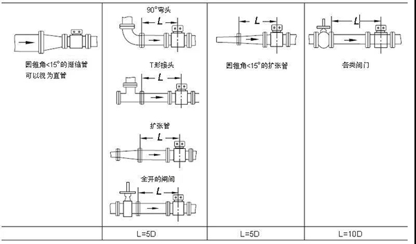 得出圖3的流速曲線有一個(gè)前提條件,就是保證流量計(jì)前后直管段的要求。為了使流過傳感器介質(zhì)流態(tài)穩(wěn)定,測量精度不受流速分布影響,通常對流量計(jì)直管段長度要求上游10D、下游5D(D為原水流量計(jì)口徑),如圖4所示。直管段是從原水流量計(jì)傳感器中點(diǎn)算起,并是不很多人以為的法蘭連接處算起。