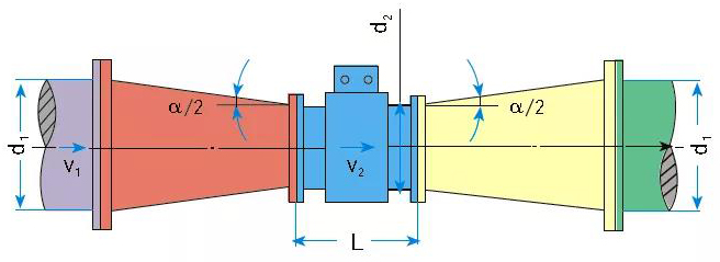 所以在有些流速偏低工況下,為了使原水流量計(jì)工作在合適的流速范圍,允許有一定的壓力損失時(shí),可以選擇流量計(jì)傳感器的口徑小于管道口徑,在儀表前后增加異徑管,提高介質(zhì)流速。異徑管的中心錐角α不大于15°,可以視為直管,如圖5。