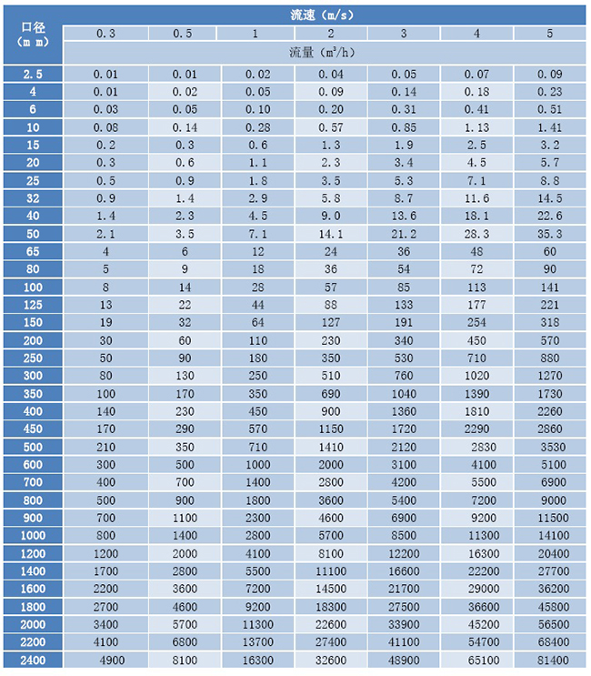 (3)流量計(jì)流速、口徑、流量對應(yīng)表