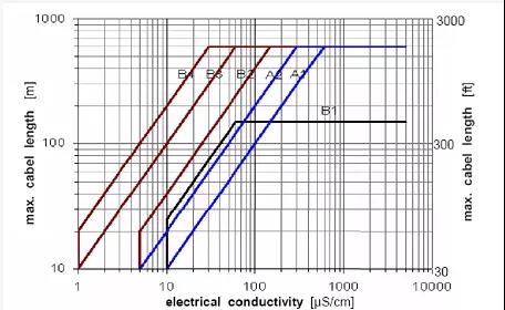 以某品*原水流量計(jì)選型樣本提供的電導(dǎo)率和電纜長度曲線為例,其中A型電纜為雙芯雙屏蔽DS300、B型電纜為雙芯三屏蔽BTS300。像浙江省一般水庫原水電導(dǎo)率在100us/cm左右,安裝所需電纜線小于100米,選A型即可,超過100米,需要選B型。