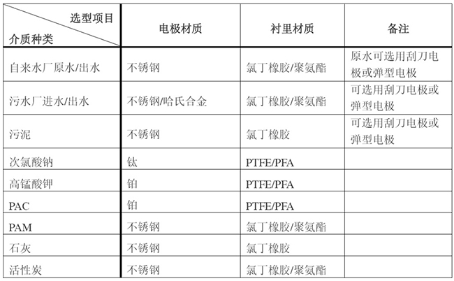 電*對被測量介質(zhì)的耐腐、抗磨蝕、無電化學(xué)反應(yīng)是選擇材質(zhì)考慮的因素。常用金屬材料有含鉬耐酸鋼、哈氏合金B(yǎng)、哈氏合金C、鈦、鉭、鉑銥合金等。由于介質(zhì)種類繁多,其腐蝕性又受溫度、濃度、流速等復(fù)雜因素影響而變化,生產(chǎn)廠僅能給出很粗略的各種電*的適用范圍。電*材質(zhì)的選擇可從使用者借鑒該介質(zhì)在其他設(shè)備的應(yīng)用實(shí)例和以往的經(jīng)驗(yàn)來確定。浙江某自來水廠用于計(jì)量5-10%次氯酸鈉投加,電*材質(zhì)選擇了哈氏合金,在運(yùn)行使用1年多的時(shí)間后,出現(xiàn)傳感器故障,返廠檢測發(fā)現(xiàn)電*腐蝕,后我司選擇鈦電*材質(zhì),現(xiàn)運(yùn)行情況良好。水行業(yè)常規(guī)選型詳見表2。