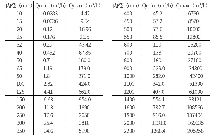 *小與*大流量對應(yīng)的流速為0.1~10m/s