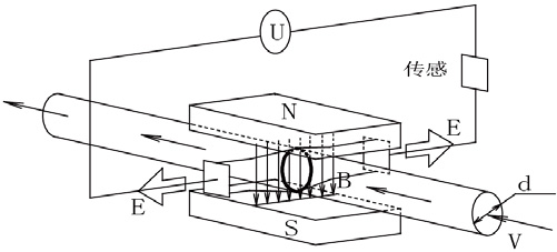 如圖,測量流量時,流體流過垂直于流動方向的磁場,導電性流體的流動感應出一個與平均流速成正比的電勢。其感應電壓信號通過兩個電*檢出,并通過電纜傳送至轉換器,經(jīng)過信號處理及相關運算后,將累計流量和瞬時流量顯示在轉換器的顯示屏上。