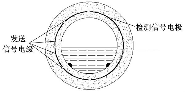 ③利用阻抗或信號(hào)衰減研制的非滿管水處理流量計(jì)。這種結(jié)構(gòu)的非滿管水處理流量計(jì)是當(dāng)前國(guó)內(nèi)研究的方向之一。其結(jié)構(gòu)是流量管底部貼一對(duì)信號(hào)發(fā)射電*,在流量管中間貼信號(hào)接收電*。由于信號(hào)在流體中傳播會(huì)產(chǎn)生衰減,且傳播時(shí)間越長(zhǎng),衰減越多,因此通過(guò)信號(hào)接收電*接收到的信號(hào)衰減量即可得知液面高度;同時(shí)該電*還能測(cè)量流體切割磁感線產(chǎn)生的電動(dòng)勢(shì),以此達(dá)到測(cè)量非滿管流量的目的。阻抗式或信號(hào)衰減非滿管水處理流量計(jì)結(jié)構(gòu)簡(jiǎn)圖如圖5所示。