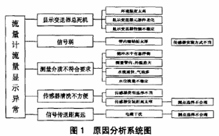 通過(guò)頭腦風(fēng)暴法對(duì)流量計(jì)顯示異常原因進(jìn)行查找,繪制系統(tǒng)圖(見(jiàn)圖1)來(lái)進(jìn)行原因分析。